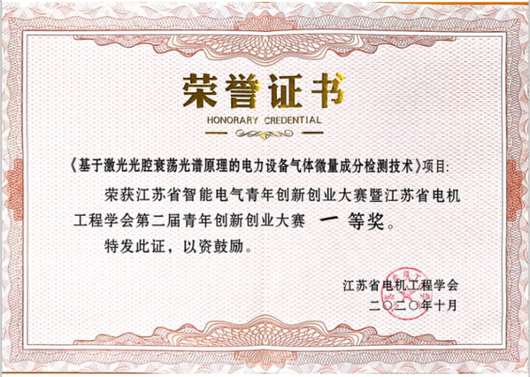 10月28日,江苏省智能电气暨江苏省电机工程学会第二届青年创新创业大赛在江苏扬中落下帷幕。本次大赛以“智能电气创赢未来”为主题,受到了江苏省内高校、电力科研、设计、生产、运维和制造等单位的积极响应。经过初赛、复赛的层层角逐,39个项目进入决赛答辩。mg4355官网张潮海教授指导的硕士研究生邹可园参赛项目“基于激光衰荡光谱原理的电力设备气体微量成分检测技术”荣获大赛一等奖。
