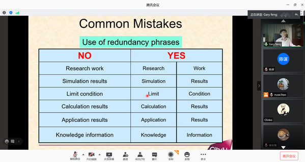随后,结合学生在撰写论文时常遇到的一些问题,Gang Feng教授通过对比的方法给出了规范的示例。最后,Gang Feng教授在参考文献、书写、语言等方面的一些细节问题上进行了相应分析和阐述。