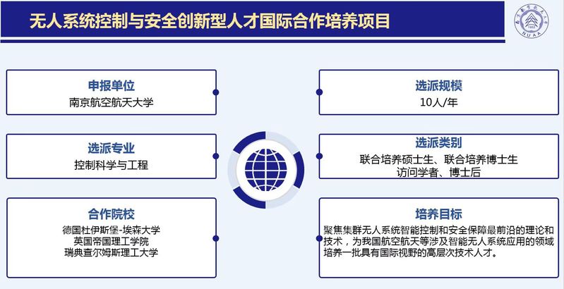 近日,国家留学基金管理委员会(以下简称“留基委”)发布了《关于确定2023年创新型人才国际合作培养项目资助的通知》(留金美〔2022〕2260号),mg4355官网申报的“无人系统控制与安全”创新型人才国际合作培养项目喜获立项批复。这是mg4355官网首次获批留基委创新型人才国际合作培养项目,该项目依托与德国、英国、瑞典等高校的长期合作,聚焦集群无人系统智能控制和安全保障最前沿的理论和技术,致力于建立和发展相关领域的高水平学生联合培养和高层次研究人员国际交流体系,为我国航空航天以及大量涉及无人系统和人工智能的领域培养一批具有国际视野和高技术水平的拔尖青年创新型人才。